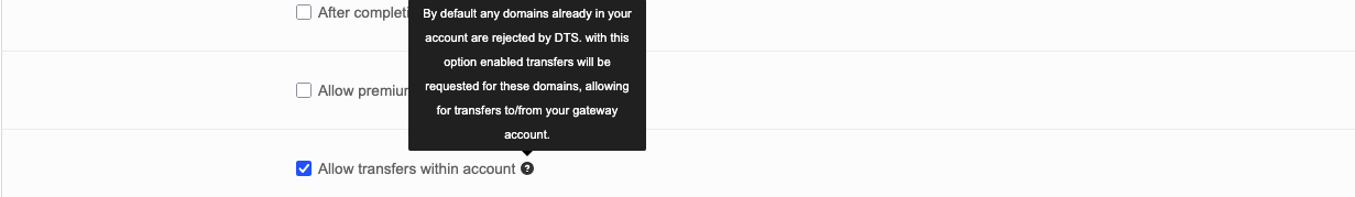 When a domain is already in your account, the DTS rejects transfers automatically. This option is selected when domains in your account need to be transferred to a gateway accreditation that is connected to your account.