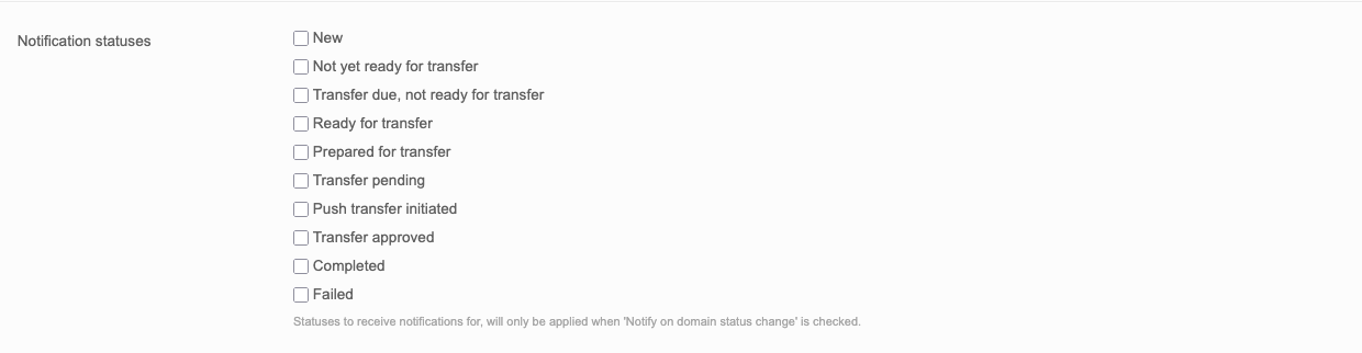 When selected, any of the statuses below will trigger a notification through the DTSDomainStatusChangedEvent.