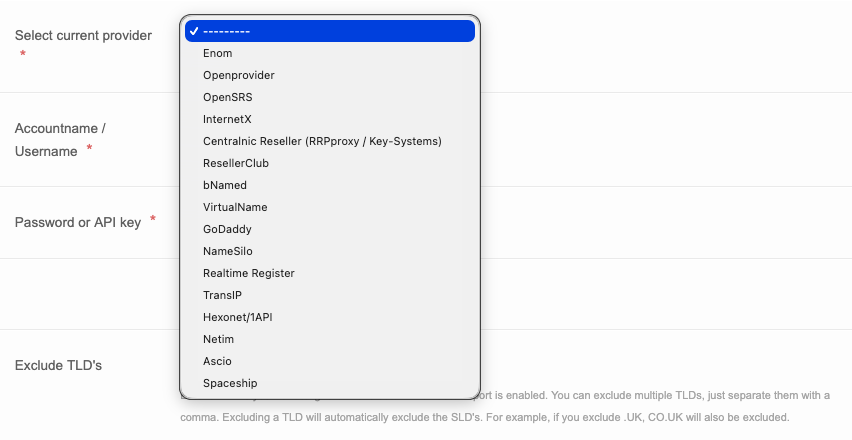 Realtime Register offers a number of providers you can automated transfer from. If you manage registrations at multiple providers you can add one provider at the time. The providers already have an API connection with are detailed below.
