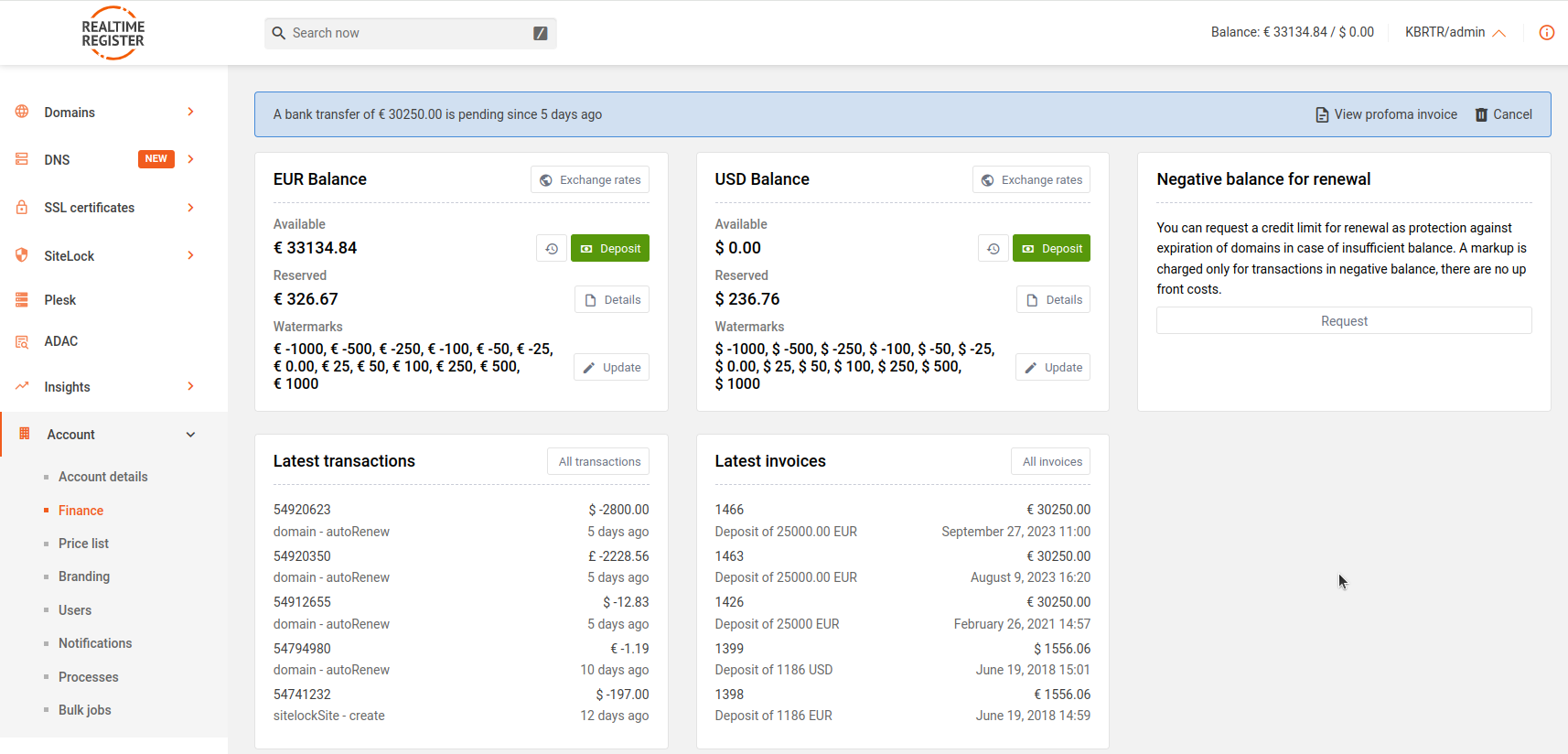On the Finance Dashboard, you can deposit funds, check pending bank transfers, request a negative balance for renewals, review your latest transactions, and download invoices. The sections below explain each option.
