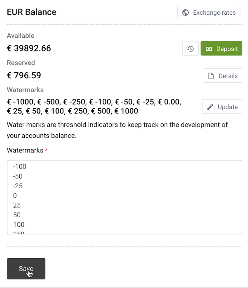 A field for customizing the watermark levels folds open. Provide the watermark levels you wish to receive notifications on and click Save to finalize any adjustments made.