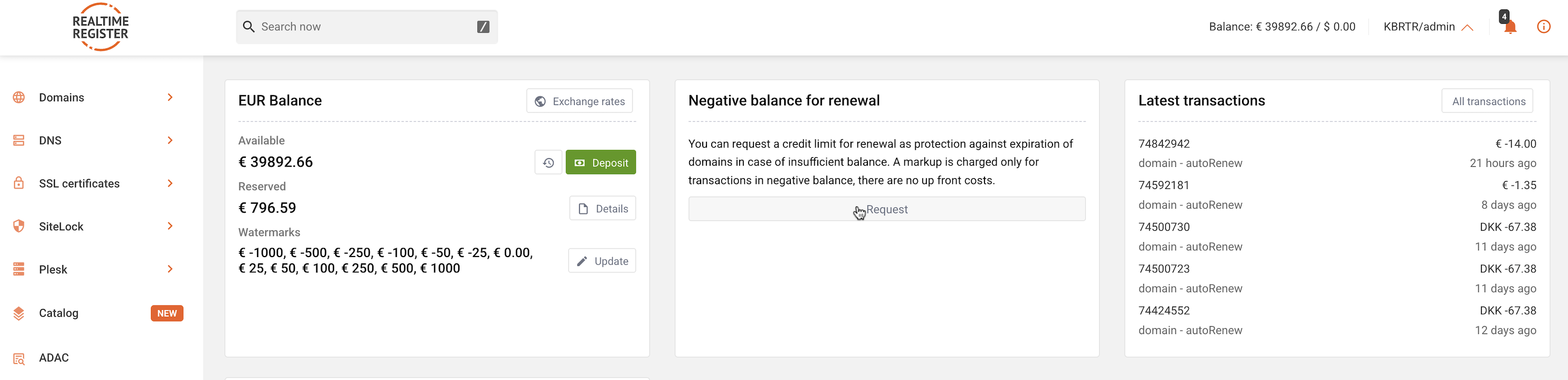 Your default email application will open with a pre-defined message requesting the option for a negative balance with our support department through email. Once your request has been reviewed by one of our support employees, you'll receive a reply to your email either confirming or denying the option to maintain a negative balance on your Realtime Register account.