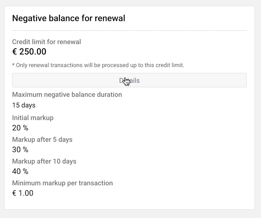Once your request has been approved, all the important information about your account's negative balance and the conditions that apply can be found on the negative balance tile. Click Details to fold open and review your account's conditions for maintaining a negative balance.
