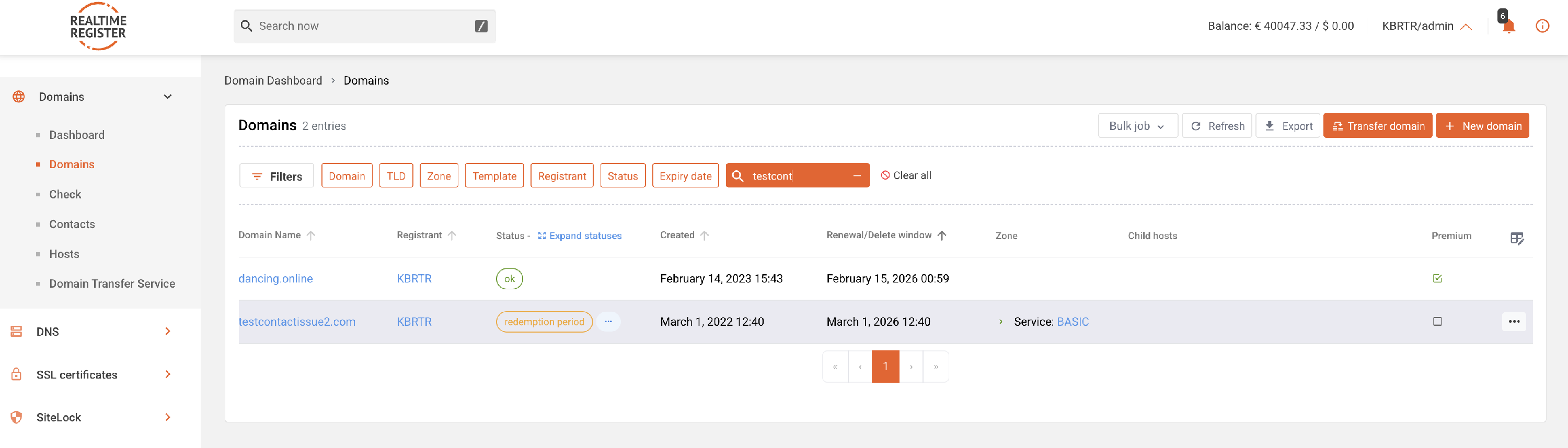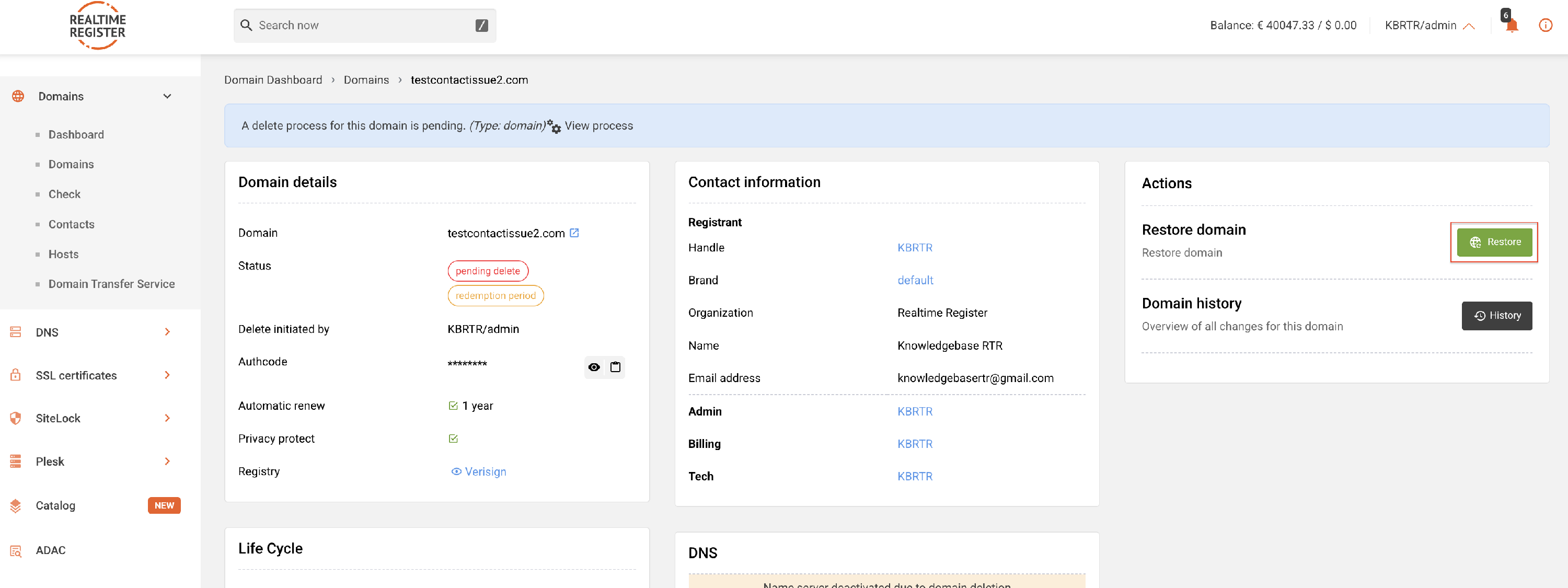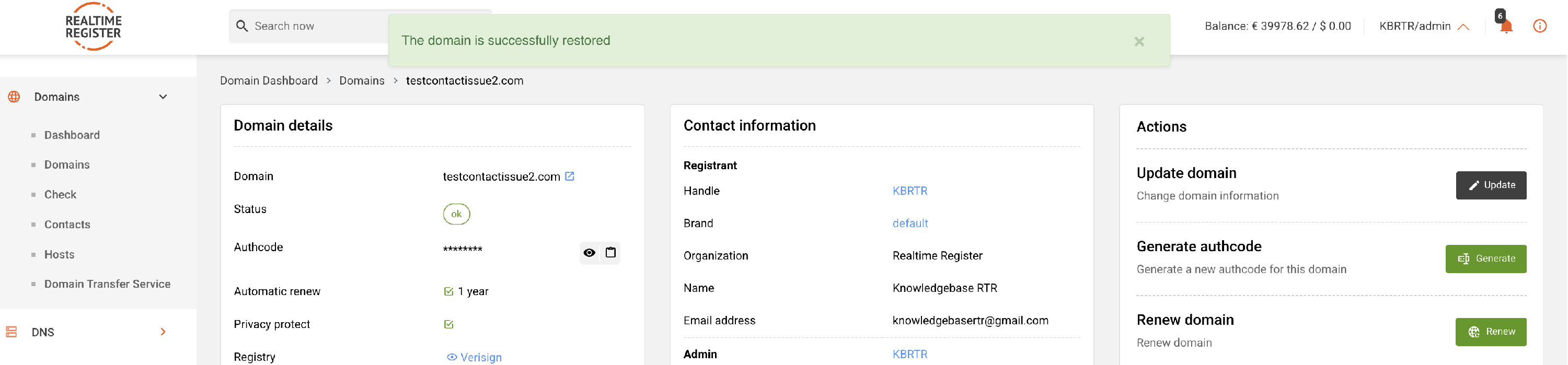 To restore a domain in your Realtime Register account, follow the steps below.
