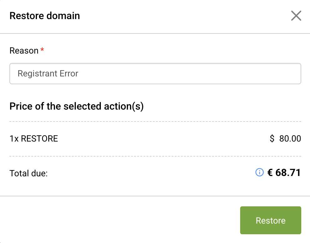 ⚠️ Not all TLDs include a renewal in the restore. More information on renewal behaviour during restore actions can be found in our TLD-metadata.