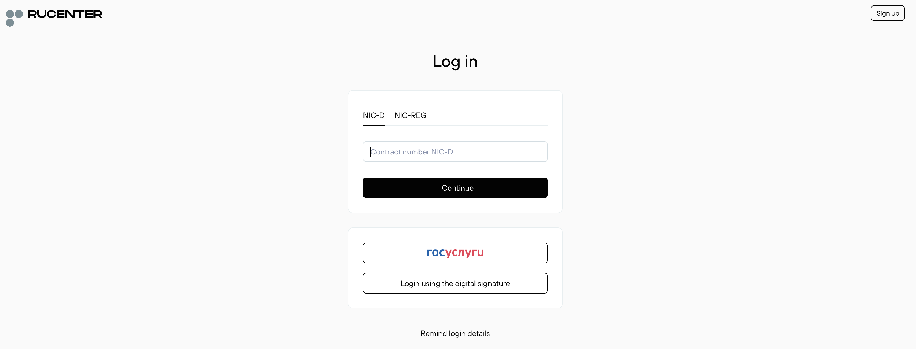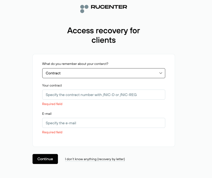 ℹ️ Have the receiving NIC-D account holder perform a password reset with the Remind login details option available on the RU-Center login page (https://www.nic.ru/en/auth/login/). To perform the password reset provide the receiving NIC-D account number in 123456/NICD format + the email address listed for the NIC-D number the password reset is requested for.