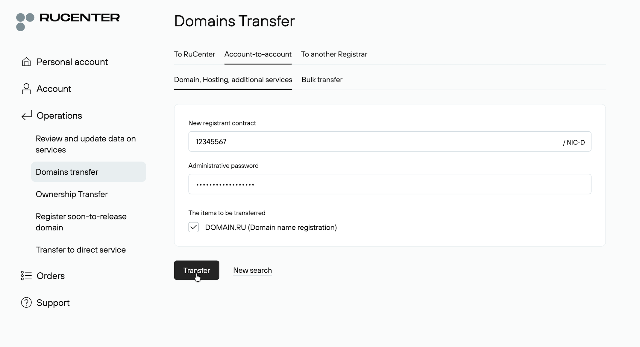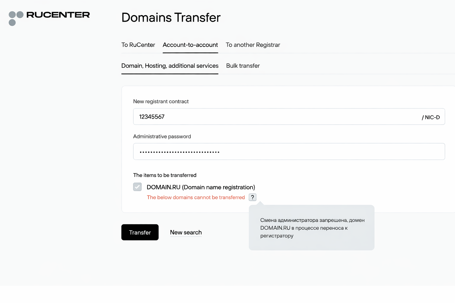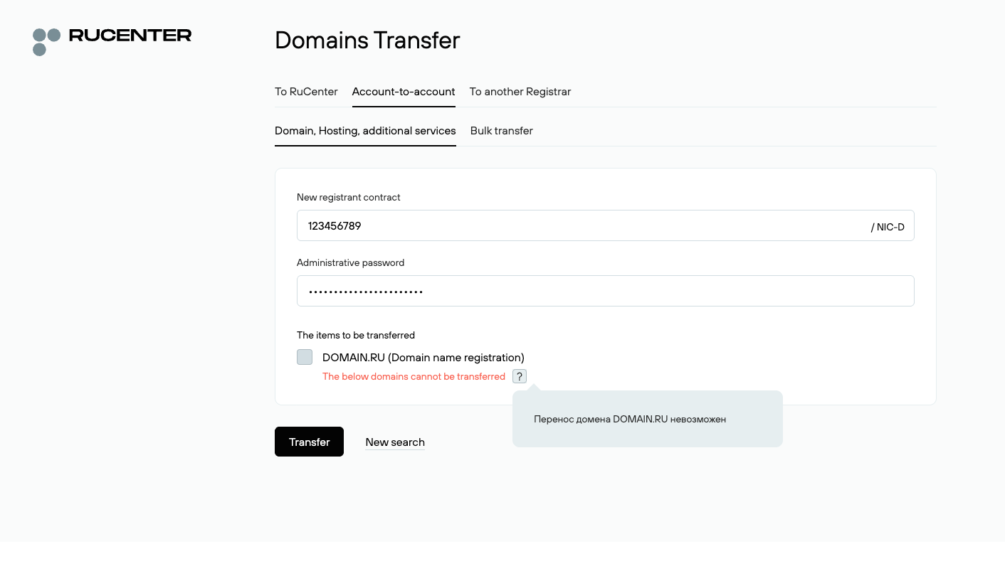 A push transfer from an existing RU-Center NIC-D account can only be done if the new NIC-D account created through our systems has exactly the same registrant data as the current NIC-D account it is registered with.