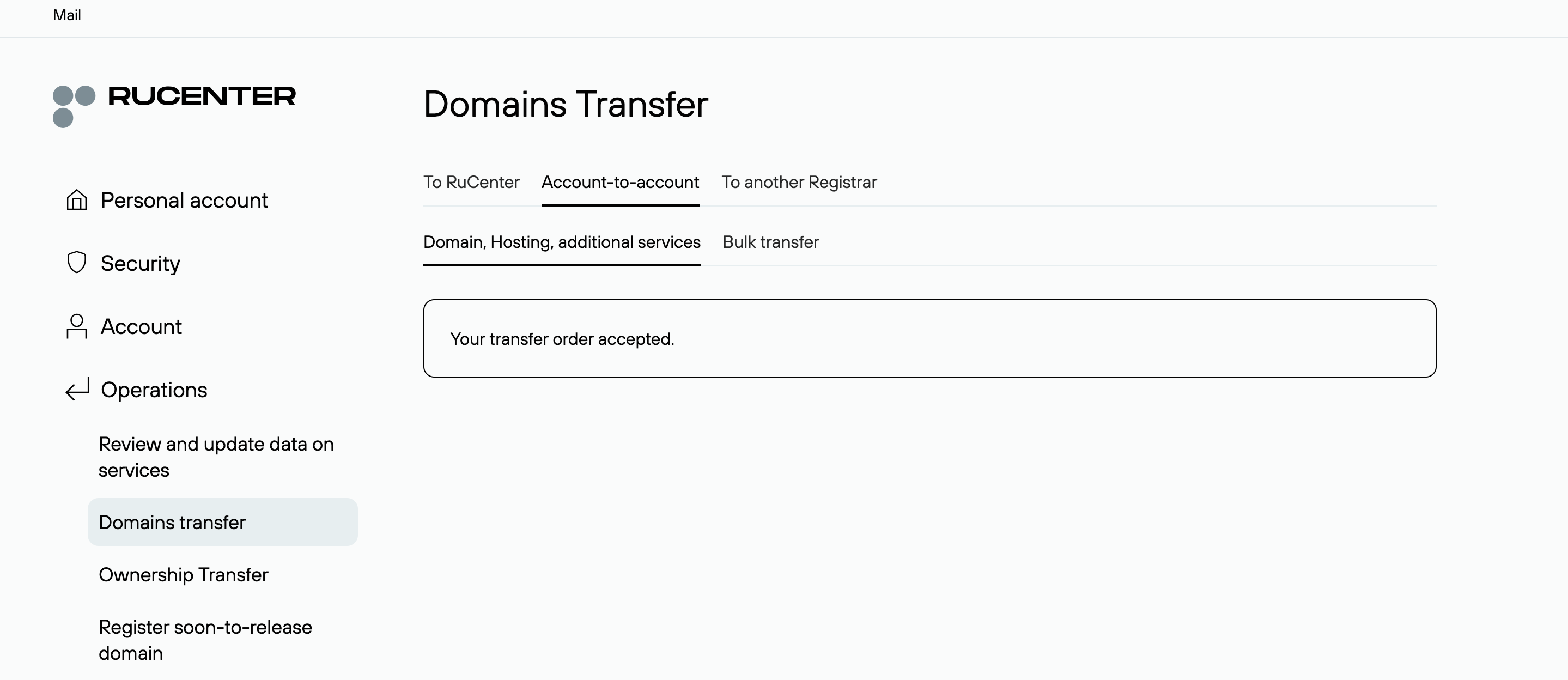 - If any additional steps are required after the push transfer has been completed at RU-Center, contact the gaining registrar/registrant for more information.