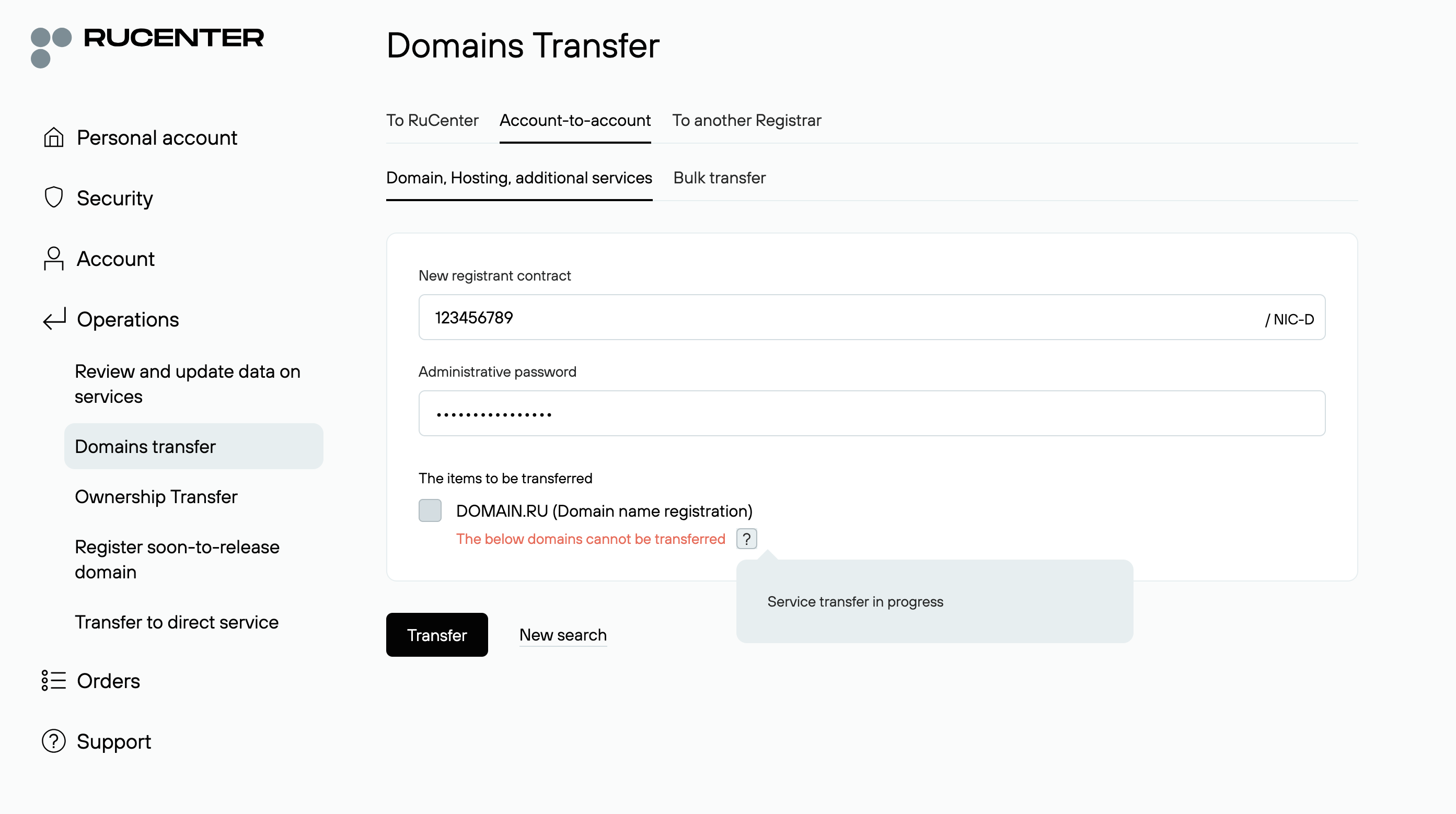 - Click Operations → Domain transfer.