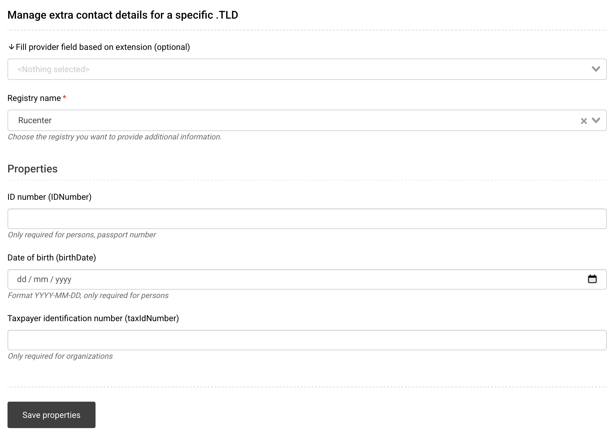 To add contact properties for .RU (RUcenter) to a contact, follow the instructions in the ➤ Contact properties KB-article and follow the instructions up until step #2. Once you select the .RU (RUcenter) contact properties option, the fields below appear.