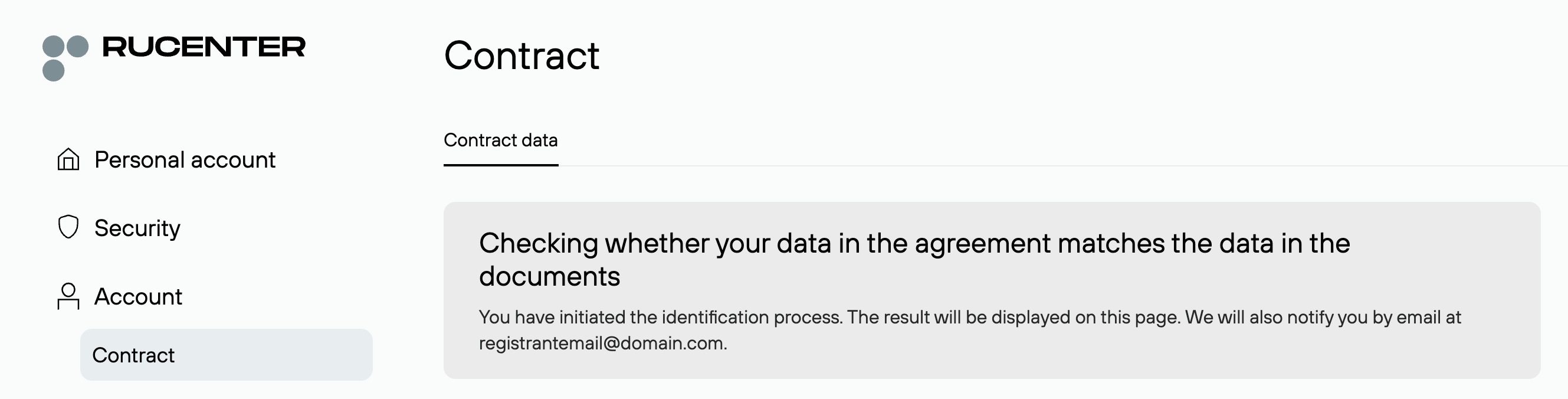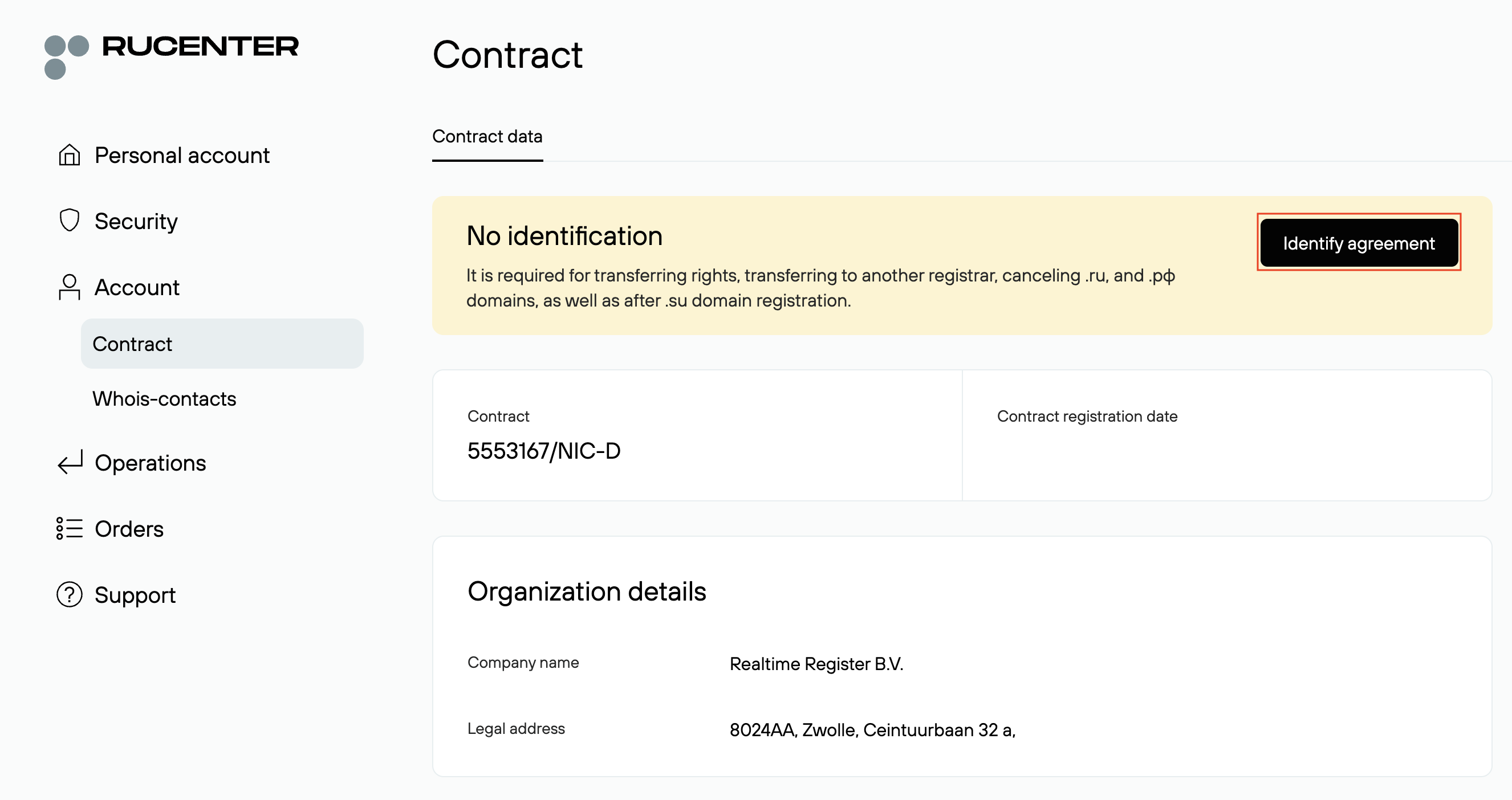 The RU-Center identity agreement process needs to be completed before an authcode can be provided to the registrant email address or a trade can be performed. To complete the Identity agreement process, have the registrant log in to their NIC-D account and follow the steps below.