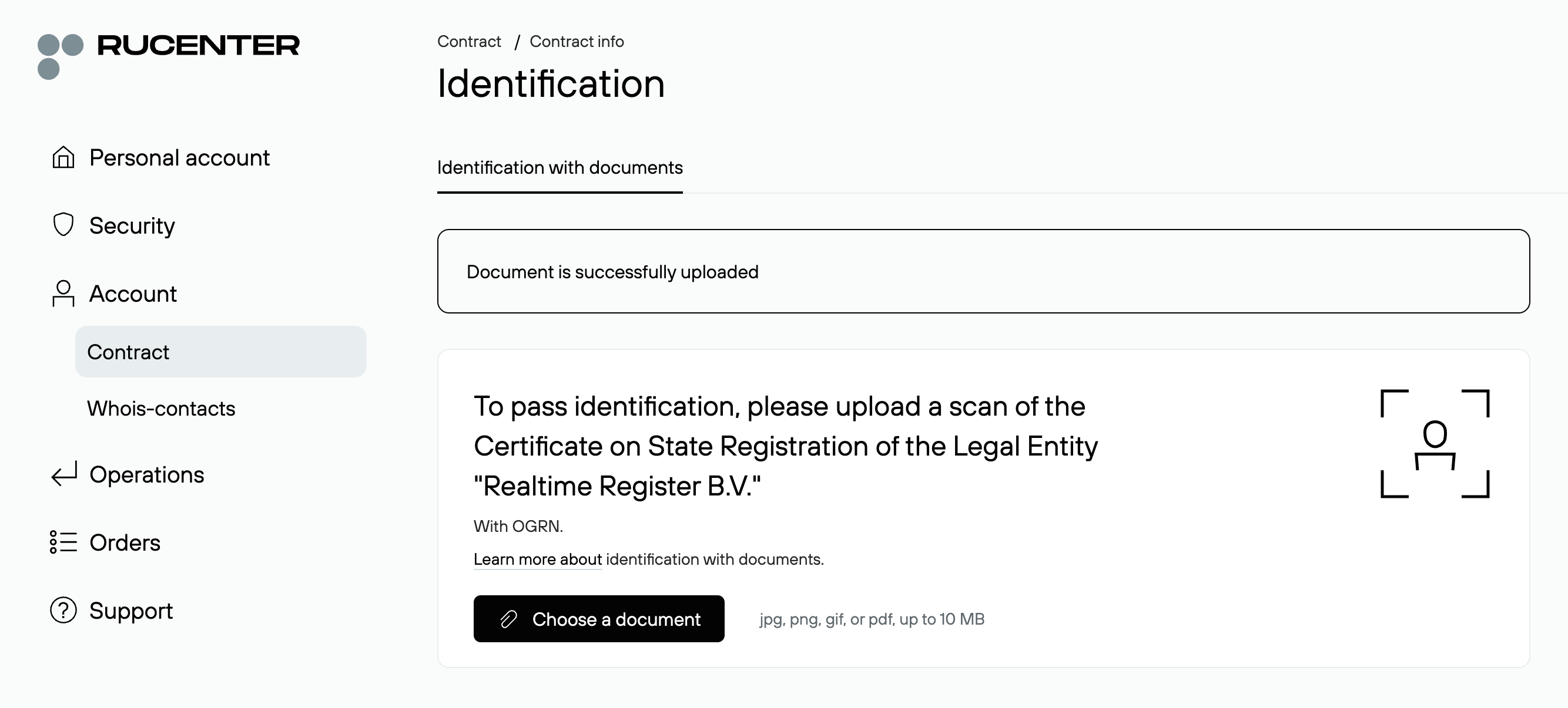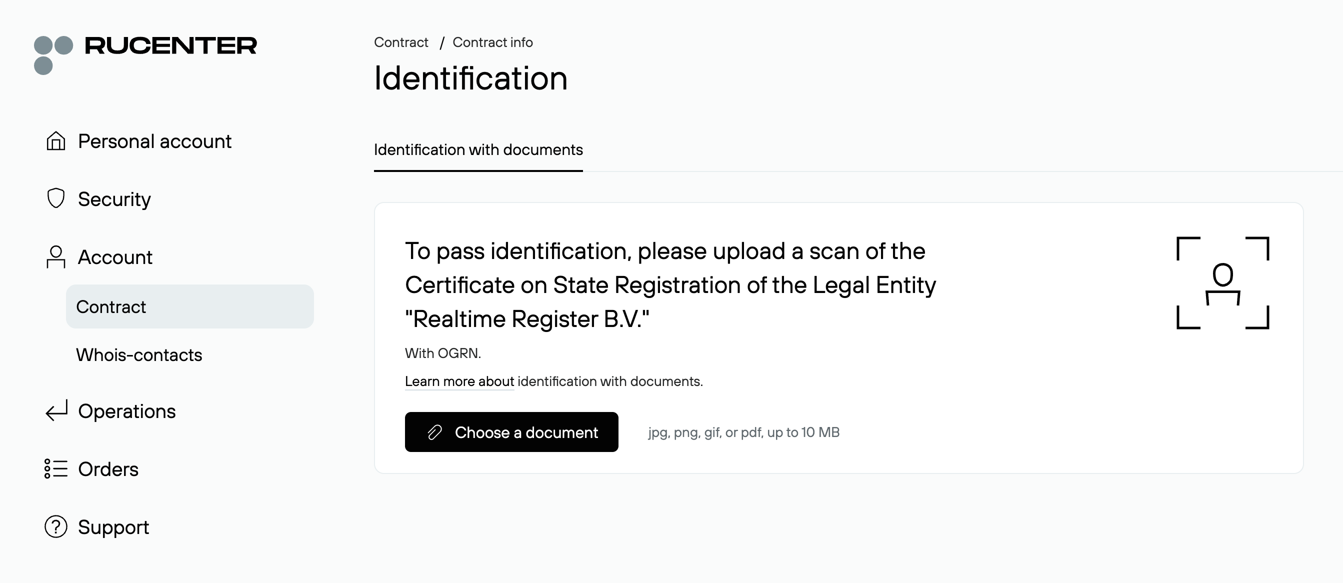 Upload a valid Identity document that matches the legal form of the registrant. Explicit instructions are displayed on screen.
